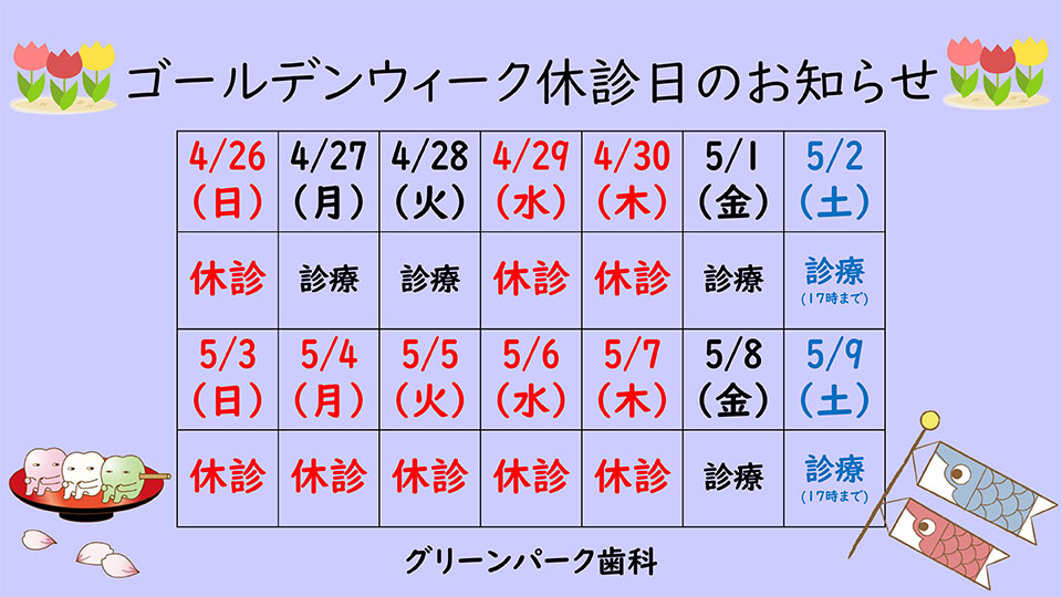 ゴールデンウィークにつき休診いたします。ご不便をおかけいたしますがよろしくお願い致します。
